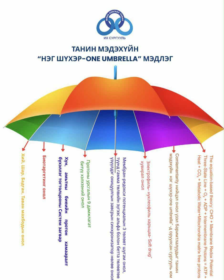 Уламжлалт анагаах ухаан, орчин үеийн анагаах ухаан - энэ хоёр анагаах ухааныг холбосон шинжлэх ухааны шийдэл, танин мэдэхүйн огтлолцох цэгийг олох боломжийг энгийнээр илэрхийлбэл- Уламжлалт анагаах ухааны ХШБ зэрэг гол онолууд бий болоод 3000 жил, Орчин үеийн анагаах ухааны амьд эсийн онол бий болоод 400 орчим жил, энэ хоёр анагаах ухааны онолыг бий болгосон өндөр сэтгэлгээт хүн бий болоод 100 мянган жил, манай дэлхий дээр цианобактери хэлбэрт амьдрал үүсээд 3,5 тэр бум жил болсон буюу Анагаах ухааны онолуудын нас нь Амьдрал үүссэн буюу огтлолцох цэгийн үүргийг гүйцэтгэдэг протон хамааралт амьдлаг тогтолцооны насны 0,0001 хувь байдаг нь хоёр анагаах ухааны шинжлэх ухааны нийцэл- огтлолцох цэгийг олох бүрэн боломж байгааг харуулна. Бид энэ шинжлэх ухааны нийцэл , огтлолцох цэгийг олоход 40 гаруй жилийг зарцуулж, 10 орчим онол гаргаж, тэднийгээ Танин мэдэхүйн нэг шүхэр - one umbrella дотор багтаасан юм.